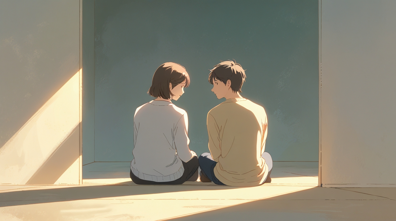 やわらかな光の中にある静かな空間。正解ではなく、ただ一緒にいるだけで呼吸が戻る関係を象徴する穏やかな風景。