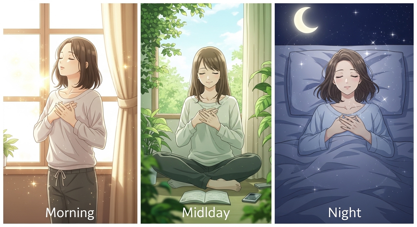 朝・夜・日中、それぞれの時間に寄り添うヒプノ的誘導文で、