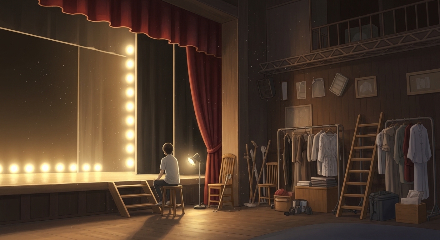 誰もいない静かな舞台に残るやわらかな光。すべてを燃やし尽くした後の、美しい静けさ。